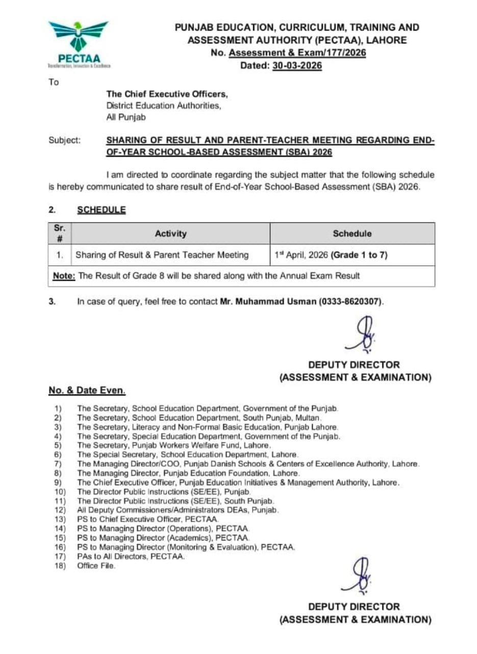 The Punjab Education, Curriculum, Training and Assessment Authority (PECTAA), Lahore has officially announced the schedule for the End-of-Year School-Based Assessment (SBA) 2026 results and Parent-Teacher Meetings.